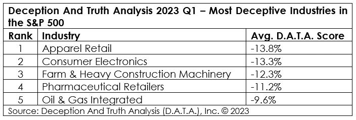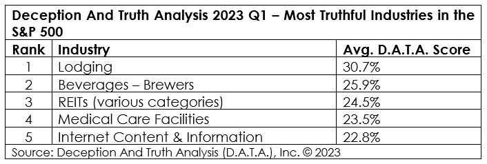 Deception And Truth Analysis (D.A.T.A.), Inc. Announces the Top Five Most Deceptive and Truthful Industries in the S&P 500 for First Quarter 2023.